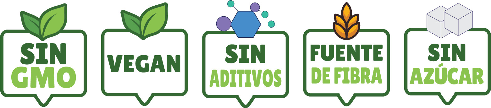Linaza en polvo, Piña en polvo, Nopal orgánico en polvo, Avena en polvo, Salvado de trigo, Inulina de agave orgánica, Semilla de chía orgánica